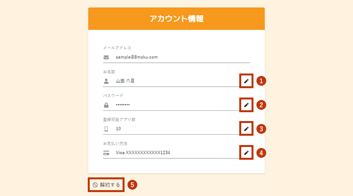 ご登録情報(お名前、パスワード、登録可能アプリ数、お支払い方法)の確認と各項目の更新ができます。