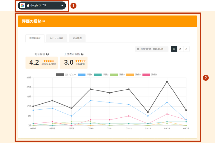 対象のアプリに対するレビュー件数や評価の推移をグラフで表示します。